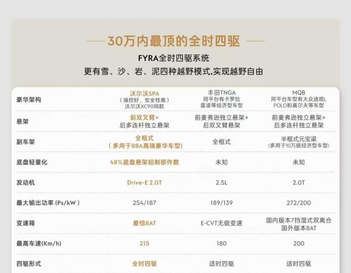 领克09的动力策略凸显“技术普惠”理念:Drive-E 2.0T T5发动机+48V轻混系统输出254马力最大功率,匹配8AT变速箱的调校兼顾城市通勤的平顺性与高速巡航的中段再加速能力。其核心优势在于全系标配FYRA全时四驱系统,提供雪/沙/岩/泥四种专业模式,相较某兰达(适时四驱,仅越野/雪地模式)与某昂PRO(适时四驱,仅雪地模式),展现出更强的全地形适应能力。